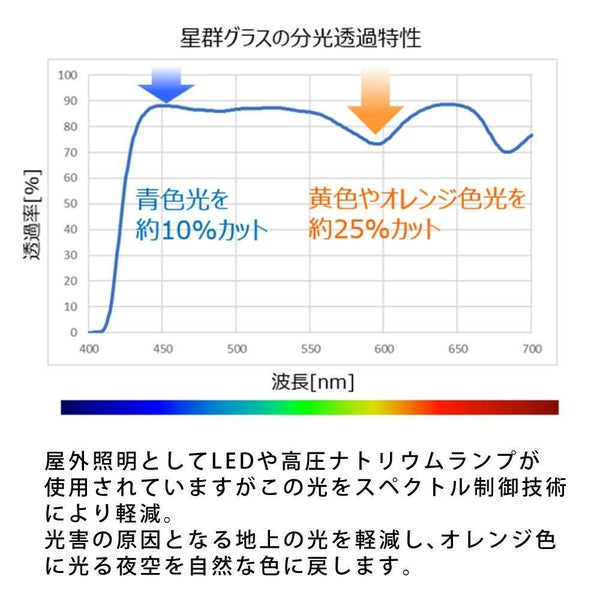 レンズに特殊な色素を練りこむ事により、光害の原因となる地上の光を軽減しオレンジ色に光る夜空を自然な色に戻します。