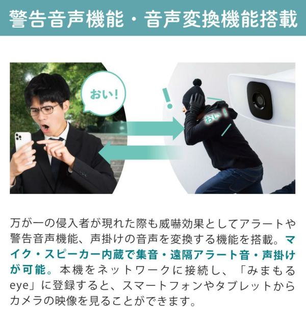 万が一の侵入者が現れた際も威嚇効果としてアラートや警告音声機能や、声掛けの音声を変換する機能を搭載。