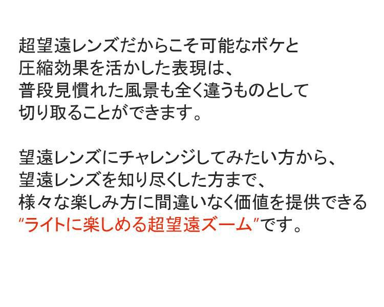 他の画像を見る (レビューでレンズキャッププレゼント)シグマ 100-400mm F5-6.3 DG DN OS(C) 富士フイルムXマウント用 販売価格 ¥ 107,900 税込 在庫切れ 詳細を見る お気に入りに登録する (0件)