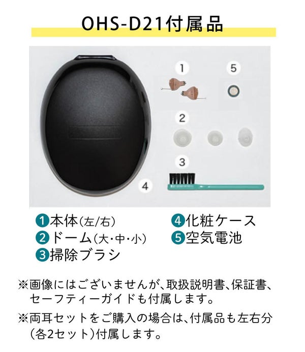 付属品 イヤードーム(大・中・小)各1、化粧ケース1、空気電池1、取扱説明書1、保証書1、掃除ブラシ1