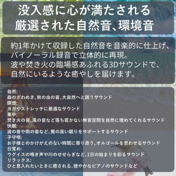自然音、環境音を耳で聞くだけでなく、日常から離れてその場に行ったような、リアルな没入感を感じることで、心が満たされて行きます。
