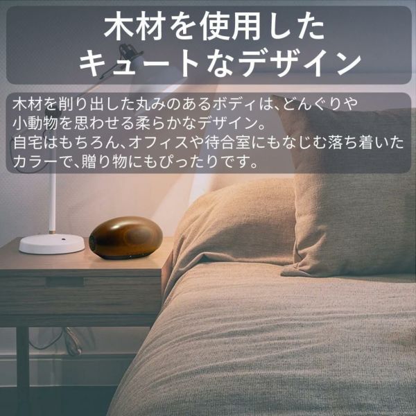 木材を削り出して作ったボディは、森のどんぐりにインスピレーションを受けた丸みを帯び、時に小動物を思わせるキュートさで、設置した空間の雰囲気を自然に和らげるようなデザインとなっています。