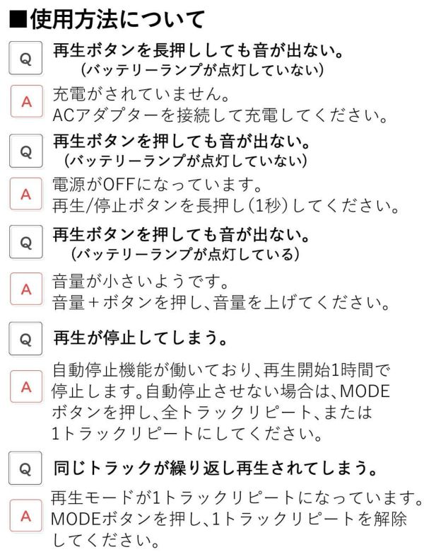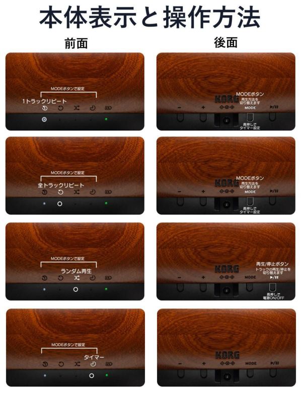 通常再生、全トラック・リピート、1トラック・リピート、ランダム再生を押すたびに切り替え。その状況は本体LEDにより確認できます。またMODEボタン長押しでタイマーのオン/オフを兼ねており、30分後に電源がオフになるタイマーを使用することができます。