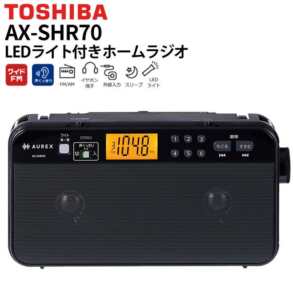 東芝 ラジオ AX?SHR70(K) は LEDライト付き の ホームラジオ で、ステレオスピーカー による 大音量・高音質 再生 と 声くっきり機能 により ニュース や トーク が はっきり 聴こえる ラジオ です。ワイド FM 対応 の AM/FM 受信 と イヤホン端子 や 外部入力 を 備え、 USB電源 および 乾電池(単2形×3本 別売)対応 の 2電源方式 で 自宅 でも 災害時 でも 使えます。便利機能 の スリープタイマー や 大きな バックライト液晶 で 視認性 も 良く、防災ラジオ・ホームラジオ として 幅広く 活躍 します。