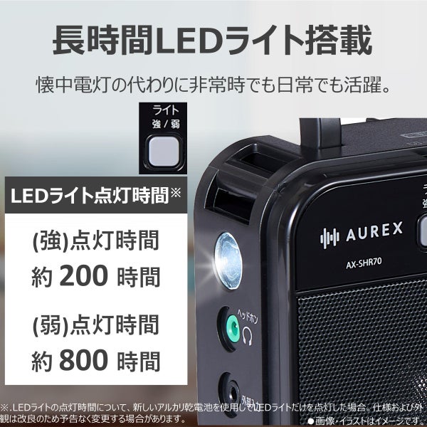 | 電池持続時間※1 | 東芝アルカリ乾電池(単2形乾電池×3本)(別売) 内蔵スピーカー使用時* FM受信:約140時間 AM受信:約160時間 LEDライト点灯時間:(強)点灯時間:約200時間/(弱)点灯時間:約800時間 外部入力時* 約350時間(3mW+3mW出力時) |