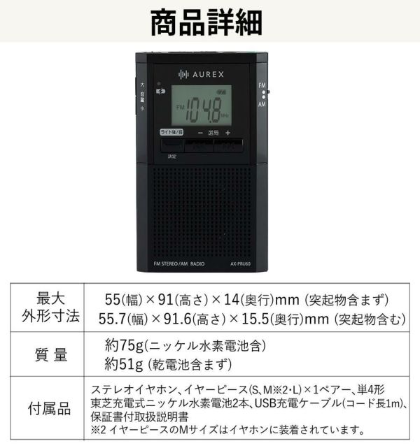 | 付属品 | ステレオイヤホン、イヤーピース(S、M*、L)×1ペア、単4形充電式ニッケル水素電池2本、USB充電ケーブル(コード長1m)、保証書付取扱説明書 |