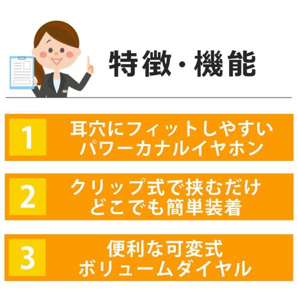 軽量 約4g の 小型 集音器 は、 片耳タイプ の イヤホン型 で 耳にフィット 。 音量調整 ・ オンオフスイッチ 搭載で 簡単操作 。 クリップ式 の おしゃれ デザインで 衣擦れ音 を軽減 。 敬老の日 や 母の日 、 父の日 の プレゼント にもおすすめの 集音デバイス 。