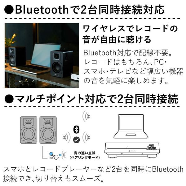 Bluetooth接続に対応したレコードプレーヤーとケーブルの配線を気にすることなくスピーカーを設置して、レコードの音を気軽に楽しめます。