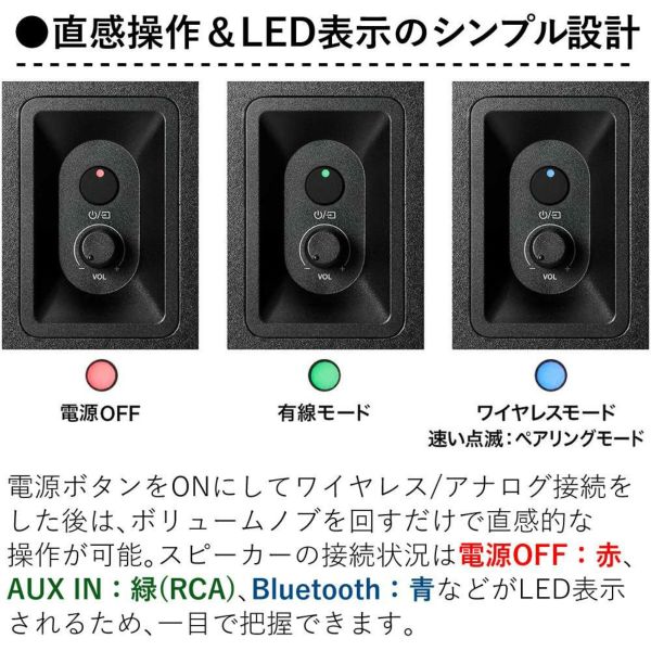 また、スピーカーの接続状況は電源OFF:赤、AUX IN:緑(RCA)、Bluetooth:青などがLED表示されるため、一目で把握できます。