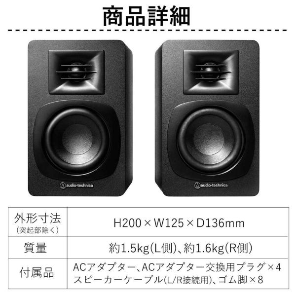 オーディオテクニカ の パワードスピーカー AT?SP3X は、 ブックシェルフスピーカー として コンパクト な 設計でありながら、 最大30W の 出力 を誇り、 フルレンジオーディオ を 実現します。 3インチ ウーファー と 1.1インチ ツイーター を 組み合わせ、 内蔵 DSP チューニング により バランス の 良い 高音質 を提供。 Bluetooth 接続 による ワイヤレスオーディオ に対応し、 マルチポイント Bluetooth で スマートフォン や レコードプレーヤー との 切り替えも 快適です。 RCA 入力 を備え、 アナログ 音質設計 にも 自信。 ミニマルデザイン と MDF エンクロージャー により 部屋 に 美しく 溶け込みつつ、 ツイーターグリル や バスレフダクト で 広がりのある 音場 を実現。 LED インジケーター の 簡単操作 も魅力です。