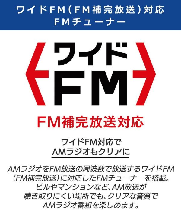AMラジオをFM放送の周波数で放送するワイドFM(FM補完放送)に対応したFMチューナーを搭載。