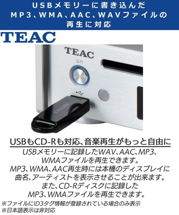 ・CD-Rに記録したMP3、WMAファイルの再生機能USBメモリーに記録したWAV、AAC、MP3、WMAファイルの再生機能