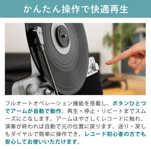 ボタンを押すだけで、アームがやさしくレコードに触れ、音楽が自然に流れ出します。再生が終われば、自動でアームが元の位置に戻る安心設計です。針を落とす手間も不安もいらないので、レコード初心者の方にもおすすめです。