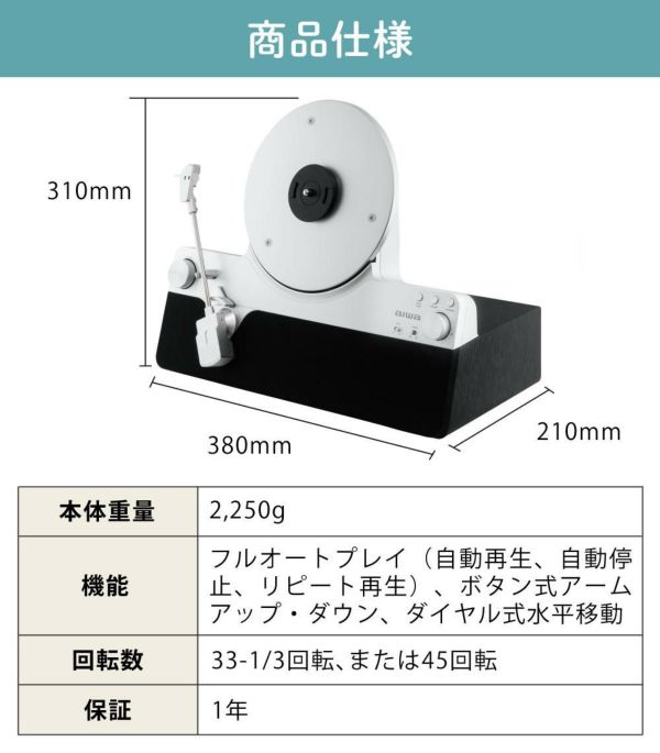 機能 | フルオートプレイ(自動再生、自動停止、リピート再生) ボタン式アームアップ・ダウン、ダイヤル式水平移動 |