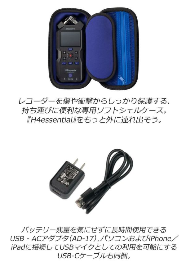 WSU-1 ヘアリーウィンドスクリーン / H4essential専用ソフトシェルケース / AD-17 ACアダプタ / USB-Cケーブル