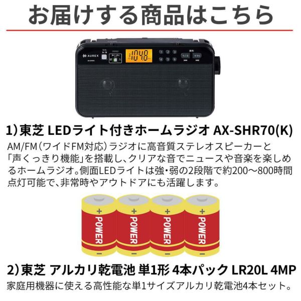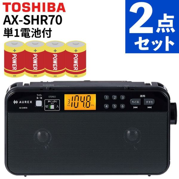 東芝 ラジオ AX?SHR70(K) は LEDライト付き の ホームラジオ で、ステレオスピーカー による 大音量・高音質 再生 と 声くっきり機能 により ニュース や トーク が はっきり 聴こえる ラジオ です。ワイド FM 対応 の AM/FM 受信 と イヤホン端子 や 外部入力 を 備え、 USB電源 および 乾電池(単2形×3本 別売)対応 の 2電源方式 で 自宅 でも 災害時 でも 使えます。便利機能 の スリープタイマー や 大きな バックライト液晶 で 視認性 も 良く、防災ラジオ・ホームラジオ として 幅広く 活躍 します。