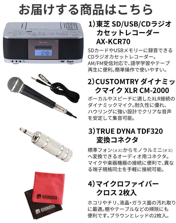 東芝 SD/USB/CDラジオカセットレコーダー AX-KCR70 は、 CDラジカセ として カセットデジタル化 や SDカード録音 USB録音 に対応した 多機能 モデルです。 MP3録音 や CD-R/RW対応 SDHC対応 USBメモリー対応 で幅広い音源を楽しめ、 Bluetooth5.3 搭載で ワイヤレススピーカー としても活躍。 キーコントロール ボーカルダウン テンポコントロール エコー機能 などの カラオケ機能 も充実しています。 ダイナミックマイク CM-2000 や 変換コネクター TDF320 マイクケーブル付き セットで、届いてすぐ本格的に使えます。
