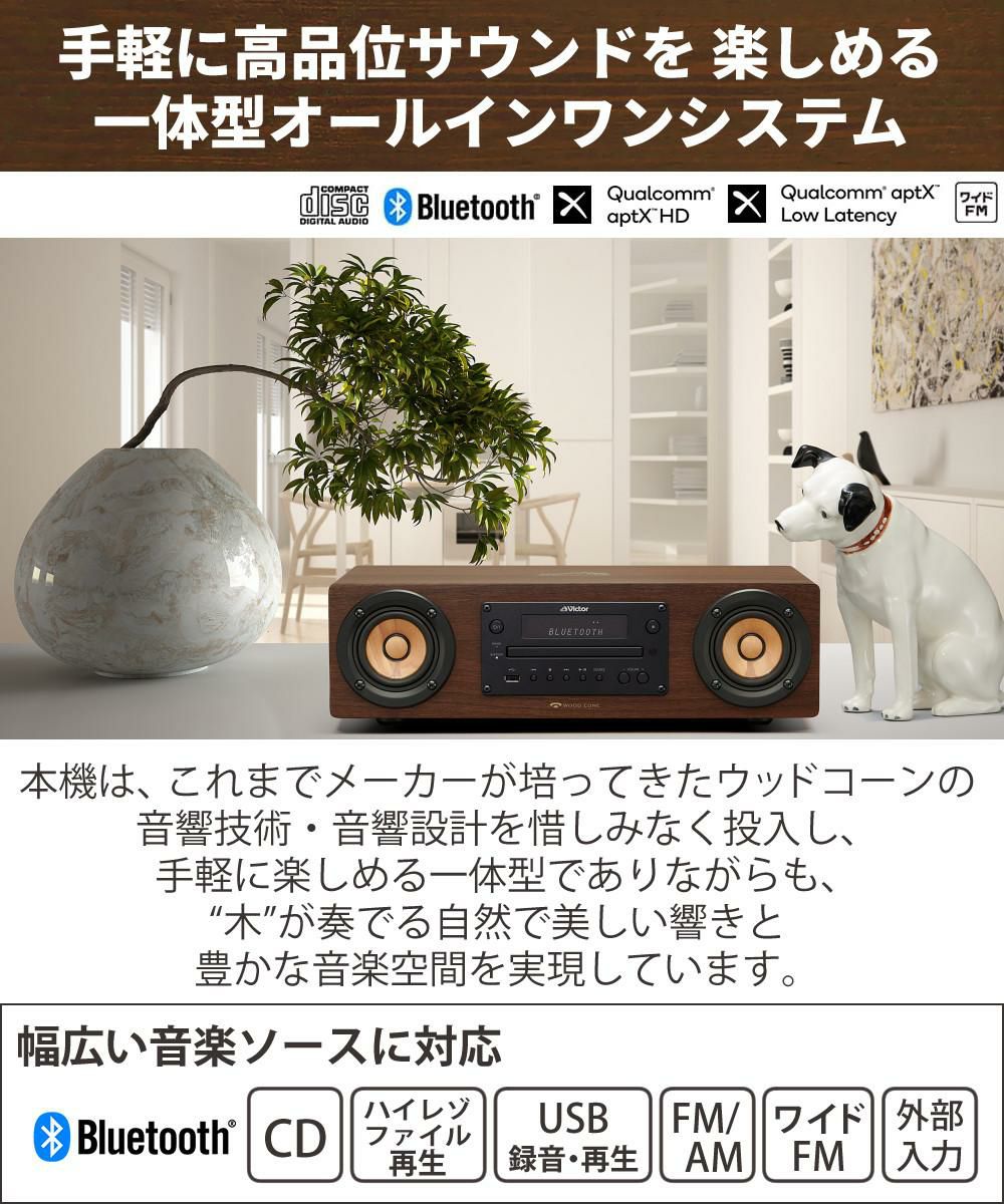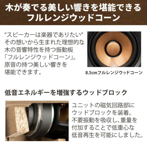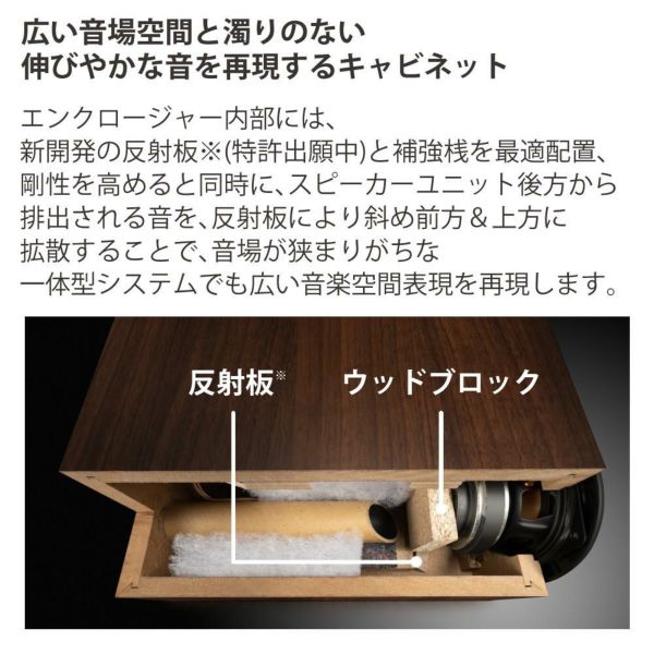 本機は、これまでメーカーが培ってきたウッドコーンの音響技術・音響設計を惜しみなく投入し、手軽に楽しめる一体型でありながらも、“木”が奏でる自然で美しい響きと豊かな音楽空間を実現しています。