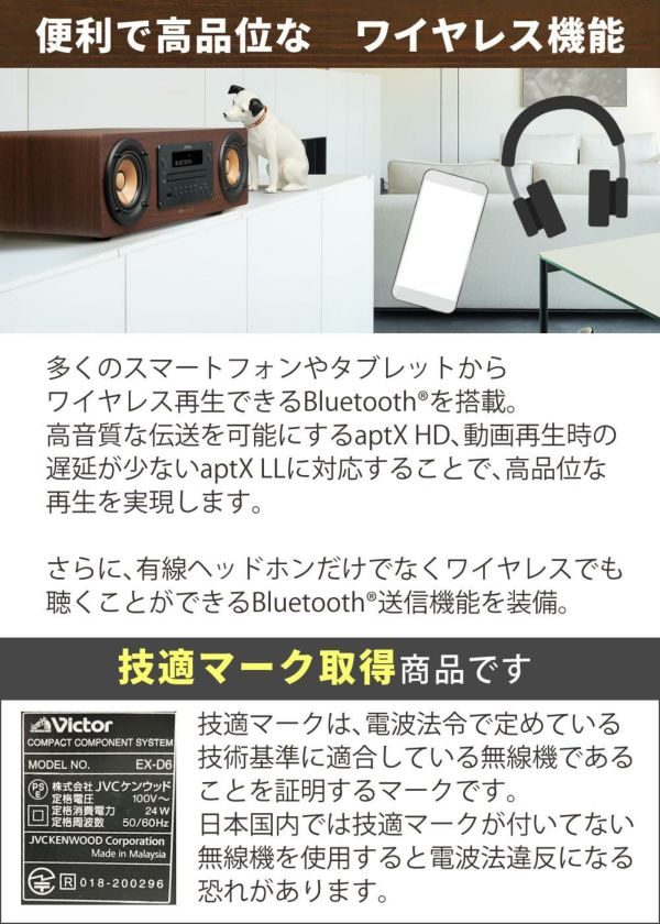 筐体はリビングやダイニング、ベッドルーム等でインテリアの一部としても楽しめるウッドボディのフラット&ローデザインに仕上げ、天板にはビクターブランドを象徴する「犬のマーク」を配置しました。