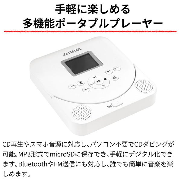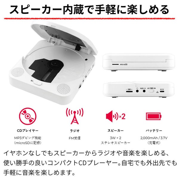 スピーカー内蔵 の ポータブルCDプレーヤー は、 Bluetooth対応 や FMラジオ 、 FMトランスミッター 機能を備えた 多機能プレーヤー です。 CDプレイヤー としてだけでなく、 スマホ接続 による 音楽再生 や MP3変換 による CDダビング も可能で、 microSD保存 に対応し手軽に デジタル化 できます。 2インチ液晶 の TFT液晶 と 簡単操作 により 高齢者向け にも使いやすく、 軽量設計 の コンパクト ボディで持ち運びも快適。 ワイヤレスイヤホン対応 や 有線イヤホン対応 に加え、 車載再生 にも便利な ポータブルオーディオ です。