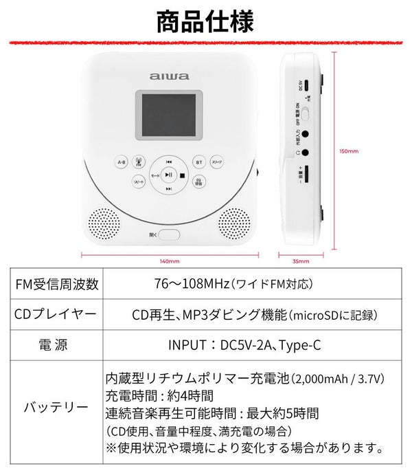 | ※すべてのデータは当社測定条件によります。都合により記載内容を予告なしに変更することがあります。 ・aiwaおよびaiwaロゴはアイワ株式会社の登録商標です。 ・その他、記載の会社名および商品・サービス名は各社の登録商標または商標です。 ・寸法および重量は当社試験によるデータであり、実際の結果は異なる場合があります。 ・画像はイメージです。 |
