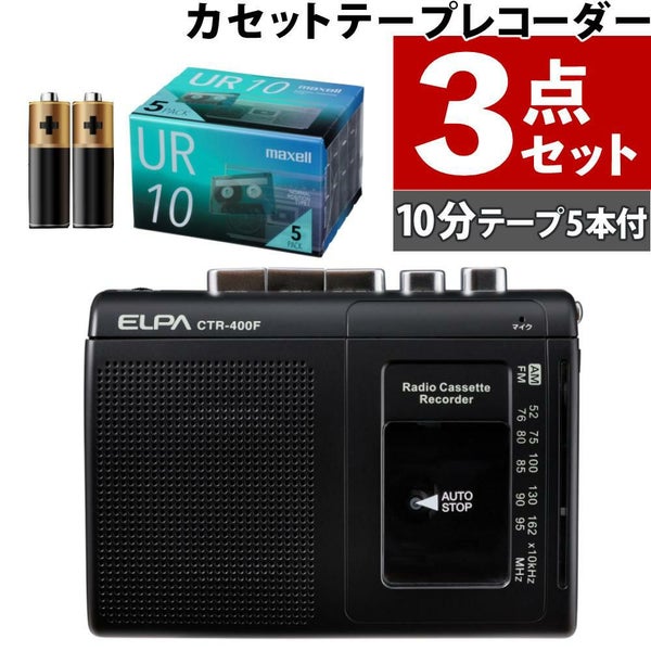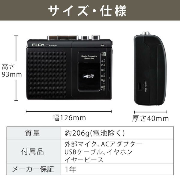 検索ワード:CTR?400F ELPA ラジオ付 カセットテープレコーダー AM FM カセットレコーダー 録音 再生 聴くモノラル USB Type-C アダプター 付属品 外部マイク