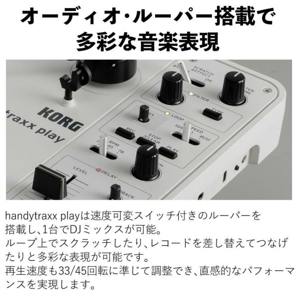KORG handytraxx play は、 ポータブル で コンパクト な レコードプレーヤー 。 バッテリー駆動 に対応し、 内蔵スピーカー や ヘッドホン端子 で快適な レコード再生 を実現。 スクラッチ機能 や イコライザー を搭載し、 DJ初心者 から上級者まで幅広く活用可能。 LP盤 や EP盤 に対応し、 高音質 でアナログ音源を再生できます。 ヴィンテージデザイン で、音楽鑑賞にも最適です。