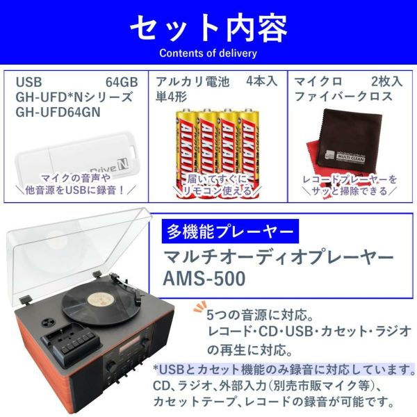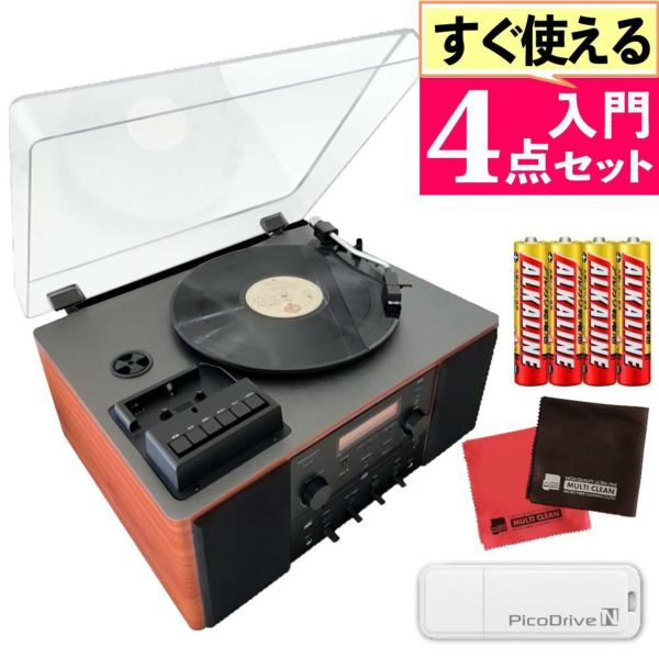 アナバス ANABAS レコードプレーヤー スピーカー内臓 MM型 カートリッジ AMS-500 USB 電池 クロス付き4点セット
