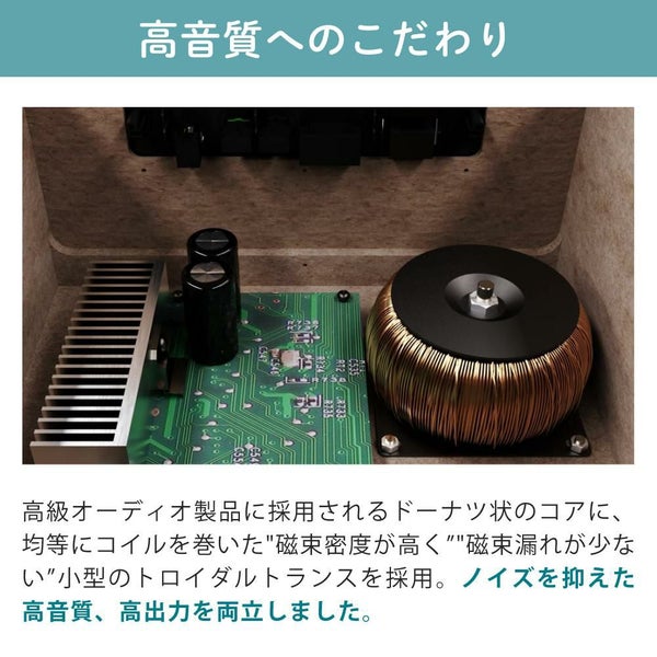 高級オーディオ製品に採用されているドーナツ状のコアに均等にコイルを巻いた磁束密度が高く、磁束漏れが少ない小型のトロイダルトランスを採用することで、小型ながらもノイズを抑えた高音質と高出力を両立しています。リップルを抑える大容量の電解コンデンサと、アンプ回路の温度上昇を抑えるアルミ素材の大型ヒートシンクを採用し、高出力でも安定した音を再現しました。