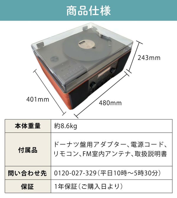 | 付属品 | ドーナツ盤用アダプター、電源コード、リモコン、FM室内アンテナ、取扱説明書 |