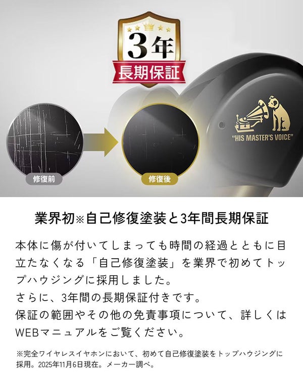 ※完全ワイヤレスイヤホンにおいて、初めて自己修復塗装をトップハウジングに採用。2025年11月6日現在。メーカー調べ。