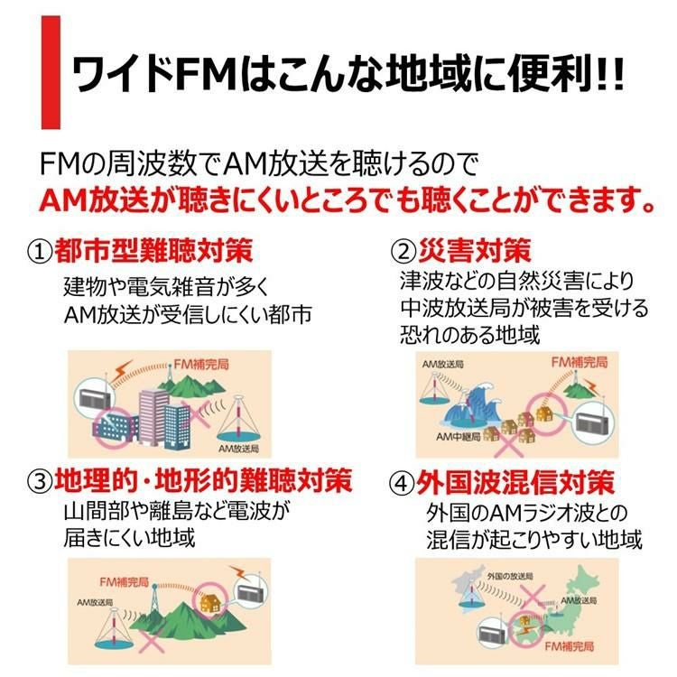 ラジオAM・FM2バンドを受信。AM放送が入りにくいところや災害時にFM周波数を用いたAM番組も聞くことができる『ワイドFM』に対応。