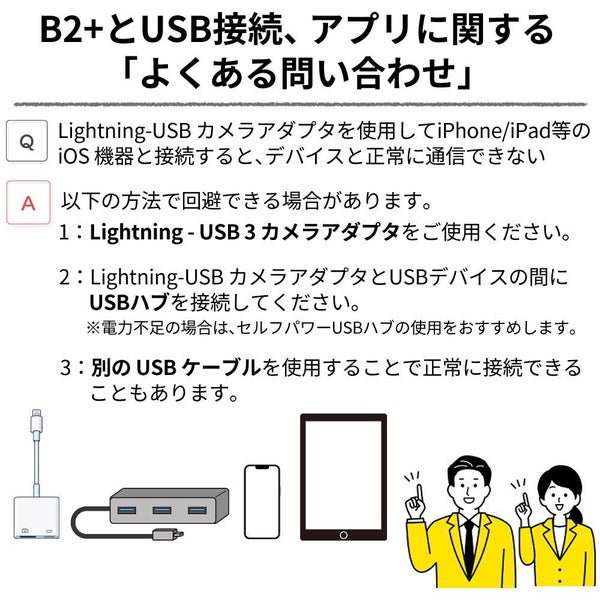 Lightning-USB カメラアダプタを使用して、iPhone/iPad などのiOS機器と接続する場合、正常に通信できないことがあります。