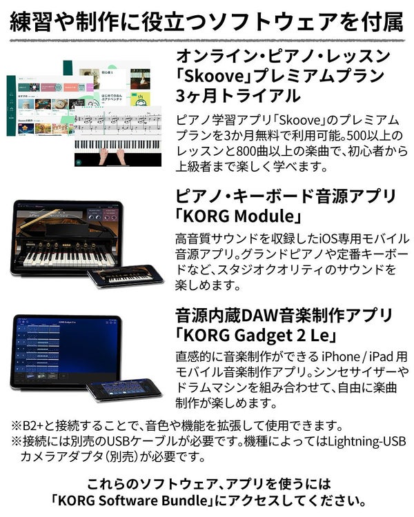さらに、ピアノ・キーボード音源アプリ「KORG Module」、音源内蔵DAW音楽制作アプリ「KORG Gadget 2 Le」に対応し、演奏や音楽制作をサポートします。