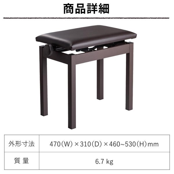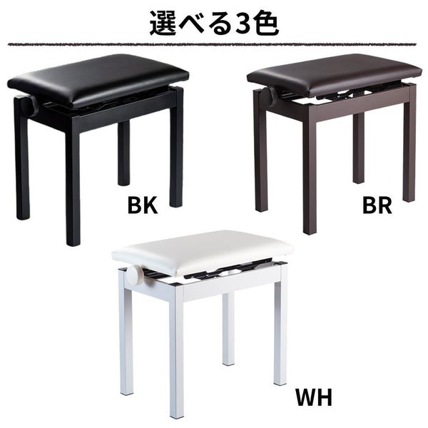 電子ピアノ椅子 として使いやすい 高低自在 構造 の ピアノ椅子 。 無段階高さ調整 が可能な ピアノベンチ で、 電子ピアノ や キーボード の 演奏時 に快適な姿勢をサポートします。 安定感 のある 4本脚ピアノ椅子 で、 自宅練習 や 音楽教室 、 演奏用チェア としても活躍。 シンプルデザイン の ピアノチェア は ブラック ・ ホワイト ・ ブラウン のカラー展開で、 インテリア にも合わせやすい仕様です。 座面クッション を備えた 楽器椅子 なので 長時間 の ピアノ練習 にも適しています。 電子ピアノ用椅子 や キーボード用椅子 として便利な ピアノアクセサリー ・ 楽器アクセサリー の定番アイテムです。