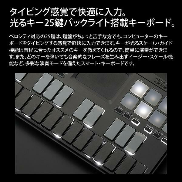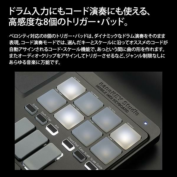 nanoKEY Studioは、イメージを瞬時に音に変換できるキーボード、ノブ、トリガー・パッド、タッチ・パッドを搭載。iPhone/iPad、Mac/Windowsとのワイヤレス接続/電池駆動が可能で、しかもA4サイズのバッグに収納。いつでもどこでも自由なパフォーマンスを可能にする、コンパクトなモバイルMIDIキーボードです。