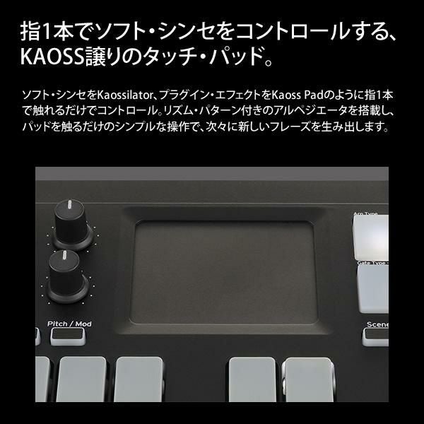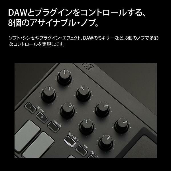 25鍵ベロシティ対応キーボード (ベロシティ・カーブ4種類)、トリガー・パッド x 8 (ベロシティ対応、ベロシティ・カーブ4種類)、ノブ x 8、X-Yパッド |