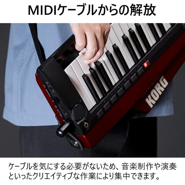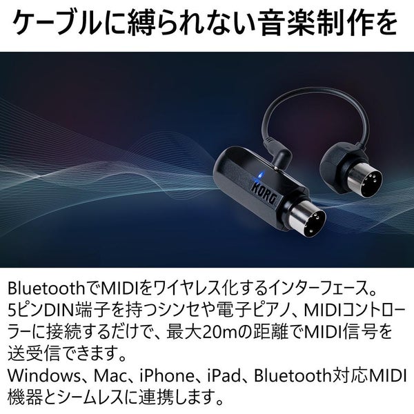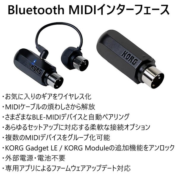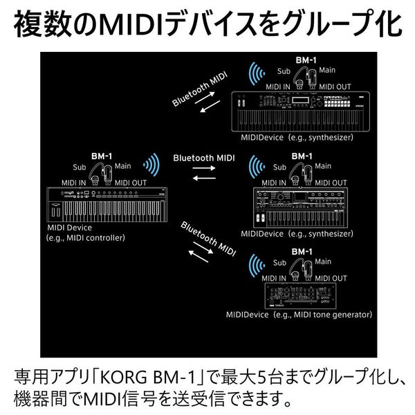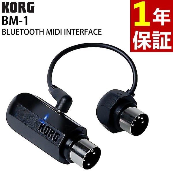 KORG BM-1 は Bluetooth 対応の MIDI インターフェースで、MIDI OUT 端子から電源供給可能な外部電源不要モデル。小型・軽量で持ち運びに便利な設計です。シンセサイザー や デジタルピアノ、MIDI コントローラーなどとワイヤレス接続し、Windows、Mac、iOS、Android 各機器で使用可能。BLE-MIDI による自動ペアリングや DAW 対応で音楽制作をスマートにサポートします。