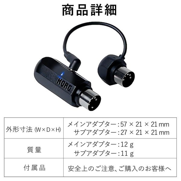 | 互換性のあるデバイス | 5ピンDIN OUTを搭載したMIDIデバイス、Bluetooth MIDIコントローラー、Bluetooth 4.0以降に対応しているMac、iPhone/iPad/iPod Touch |