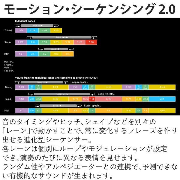 | デスティネーション | 個々のモーション・シーケンス・ステップのパラメーターを含む、ほとんどのパラメーターをモジュレートできます モーション・シーケンスの長さに応じて、プログラムごとに1,000以上のモジュレーションを設定することができます。 |