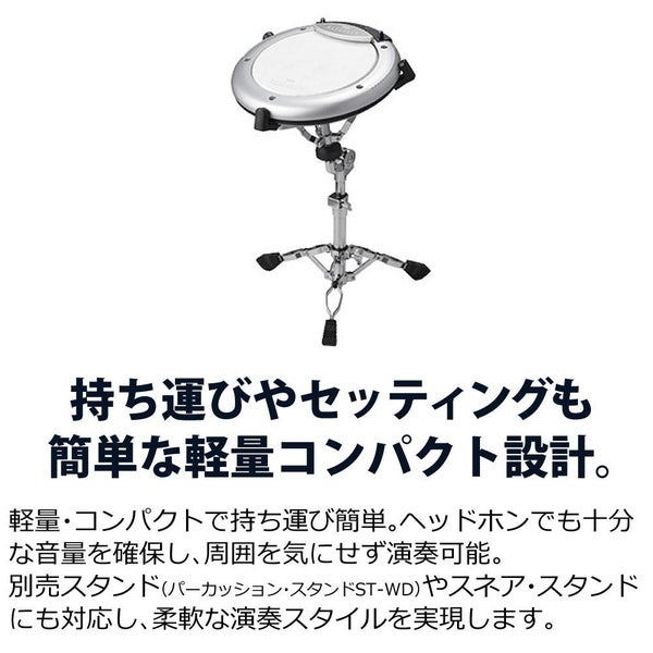 別売の立奏用スタンド(パーカッション・スタンドST-WD)や、市販のスネア・スタンドへ取り付けて演奏することもでき、従来のアコースティック楽器ではあり得なかったカジュアルさもWAVEDRUMの魅力の一つです。