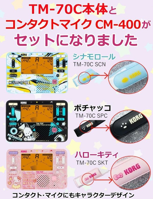 多彩な機能と高い視認性を備えたチューナー・メトロノーム TM-70F と、楽器に取り付けて振動を直接キャッチできるクリップ式コンタクト・マイク CM-400 がセットになった TM-70C に、ハローキティ、ポチャッコ、シナモロールのサンリオキャラクターズ特別デザインが登場!