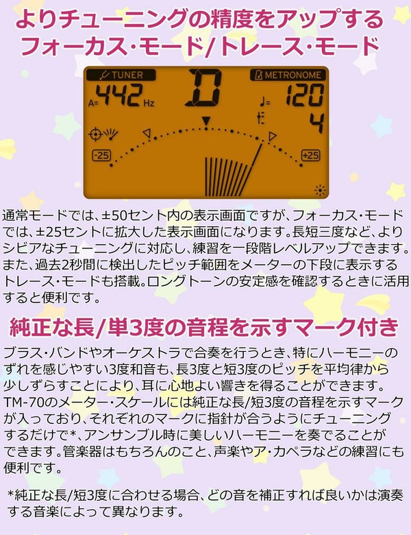 TM-70 のメーター・スケールには純正な長/短3度の音程を示すマークが入っており、それぞれのマークに指針が合うようにチューニングするだけで*、アンサンブル時に美しいハーモニーを奏でることができます。