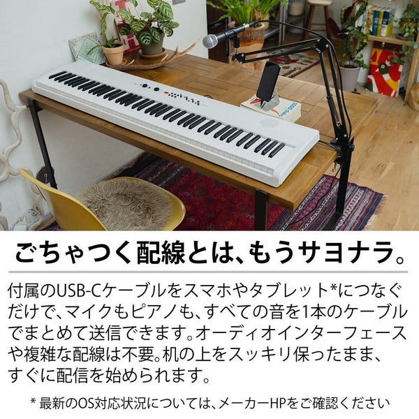 ●付属のUSB-Cケーブルをスマホやタブレット※につなぐだけで、マイクもピアノも、すべての音を1本のケーブルでまとめて送信。
