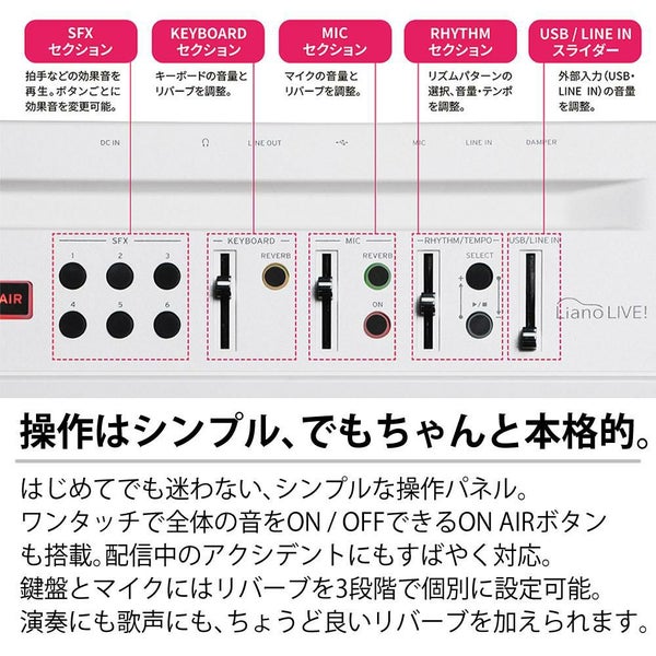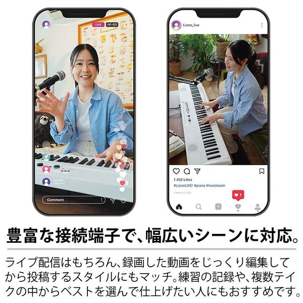 KORG Liano LIVE L1 LIVE は ライブストリーミングピアノ として最適な デジタルピアノ で 電子ピアノ 初心者向け に設計されています。 オールインワン の 88鍵盤 フルサイズ 仕様 で マイク内蔵、USB-C 接続 で スマホ接続 も簡単。 LS鍵盤 の ライトタッチ で 演奏 しやすく、内蔵 スピーカー から豊かな 音色 を楽しめます。 8音色 や リズム SFX 機能 もあり SNS投稿 や ライブ配信 用 にも活躍。 軽量 コンパクト で 電池駆動 可能、 ポータブル に扱える 電子ピアノ です。