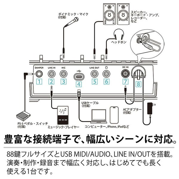 ●88鍵フルサイズ鍵盤、USB MIDI/AUDIO入出力、LINE IN/OUT端子などを搭載。