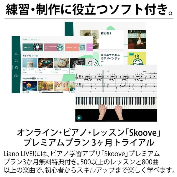 Liano LIVE!には、全世界で300万人以上のユーザーに信頼されているピアノ学習アプリ「Skoove(スクーヴ)」のプレミアムプランを3か月間無料でご利用いただける特典が付属。