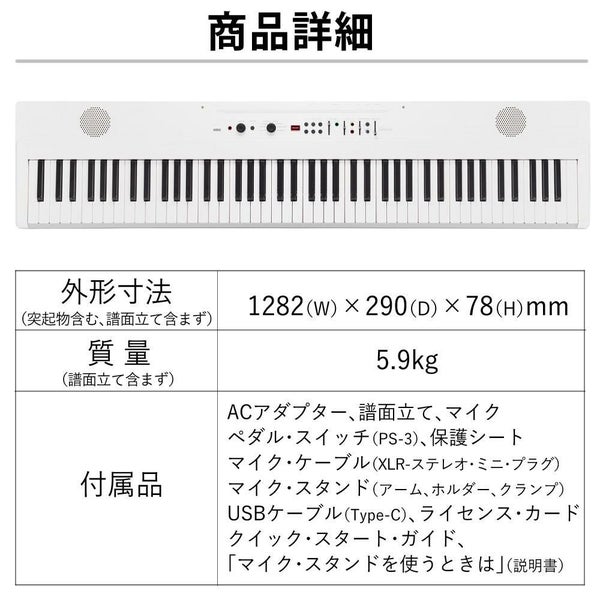 【付属品】ACアダプター、譜面立て、ペダル・スイッチ(PS-3)、マイク、マイク・スタンド(アーム、ホルダー、クランプ)、保護シート、マイク・ケーブル(XLR-ステレオ・ミニ・プラグ)、USBケーブル(Type-C)、クイック・スタート・ガイド、「マイク・スタンドを使うときは」(説明書)、ライセンス・カード |