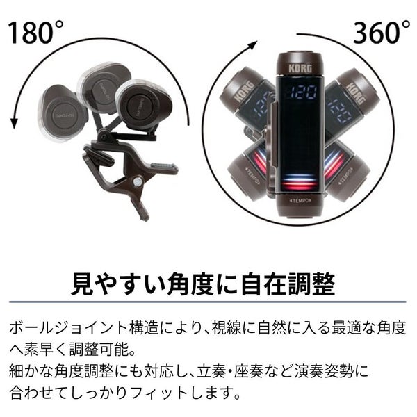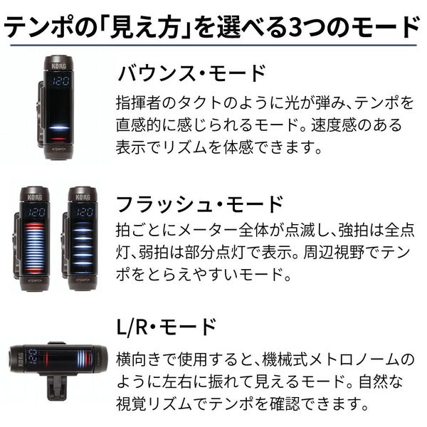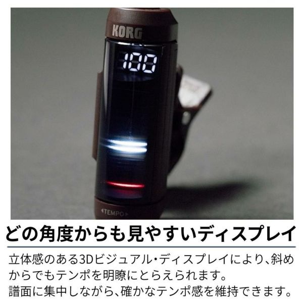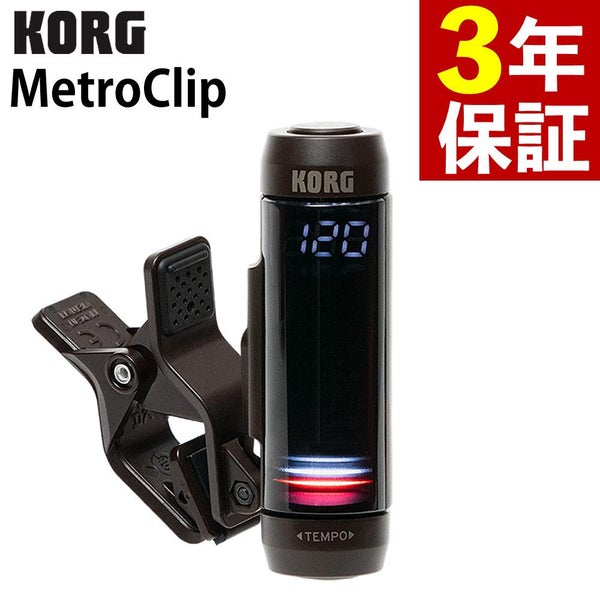 KORG MetroClip クリップオン メトロノーム MTC?1 は 演奏 用 の 新しい 発想 の クリップ式 メトロノーム です 譜面台 や 楽器 ベル 衣服 へ 装着 できる コンパクト な クリップオン デザイン で 高視認性 の 3D ディスプレイ が 視覚 で テンポ を 捕らえます バウンス モード フラッシュ モード L/R モード など 多彩 な 表示 モード と 0~12拍子 16分音符 まで 対応 の ビート設定 は 練習 や マーチング に 最適 単4 電池 で 長時間 駆動 し オートパワーオフ 付き 3年 保証 で 安心 です