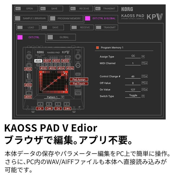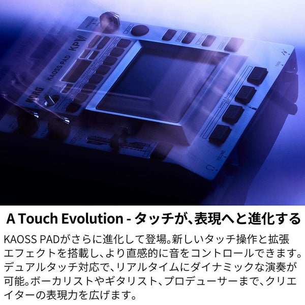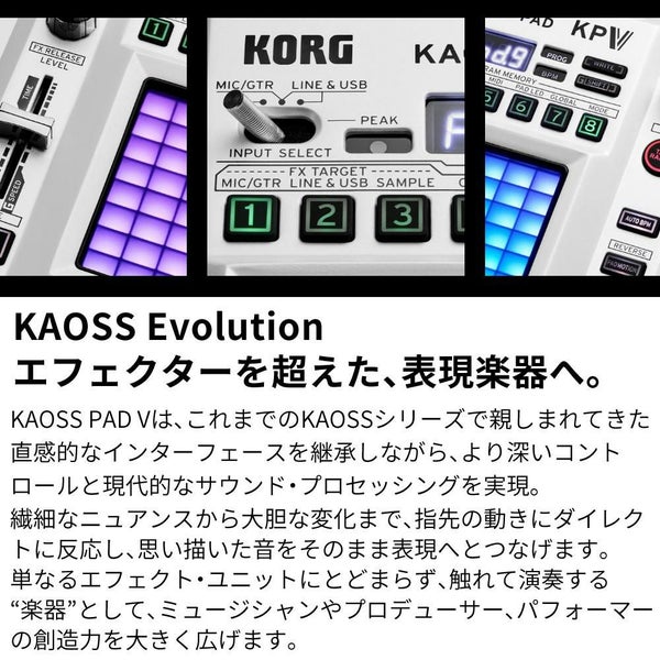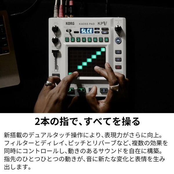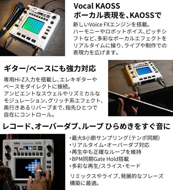 KORG KAOSS PAD V KPV は タッチパッド XYパッド と デュアルタッチ で リアルタイム に 音色 を 操る ダイナミックエフェクト サンプラー です 。 Voice FX により ボーカルエフェクト も 強化 し 、 ハーモニー ロボットボイス ピッチシフト など を 直感操作 。 Hi-Z 入力 で ギター ベース も 直接 接続 でき 、 LINE IN と USB Type-B で PC オーディオ も ミックス 可能 。 USBオーディオインターフェース として DAW 録音 にも 対応 します 。 サンプリング ループ オーバーダブ は 最大 8小節 、 BPM同期 Gate Hold や スライス で リミックス や ライブ 配信 に 活躍 。 270プログラム と SDカード SDHC 32GB 保存 で 制作 を 加速 します 。
